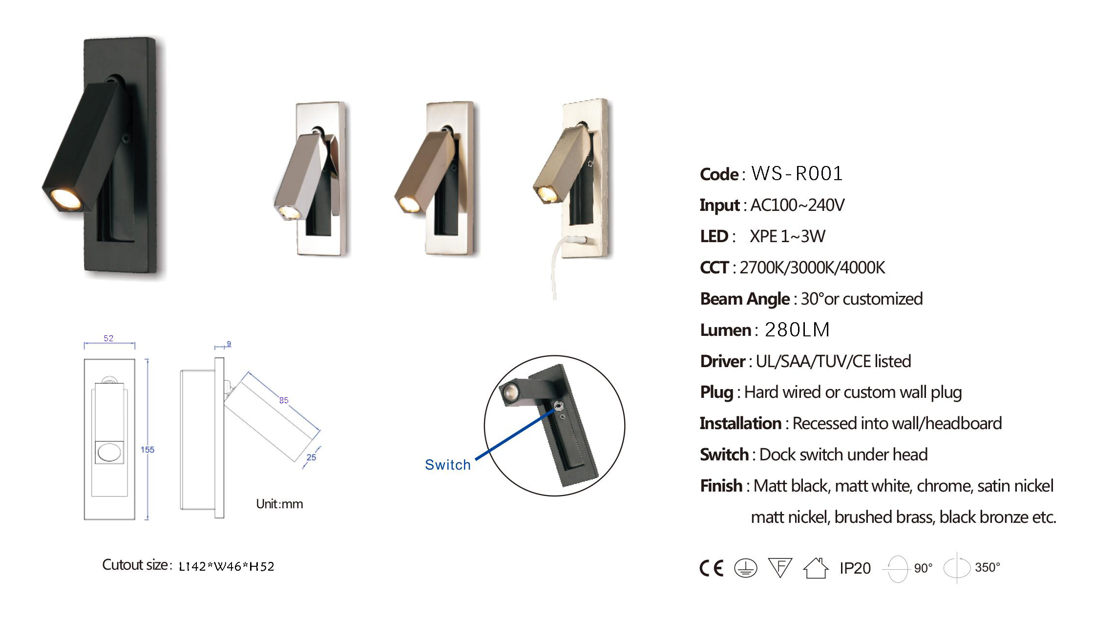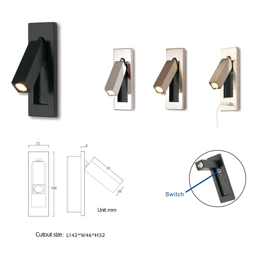 ضوء القراءة الجدار الداخلي بجانب السرير فندق مصباح قراءة قابل للتعديل LED اللوح الأمامي مصباح